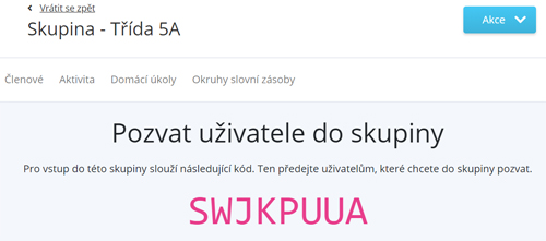 Stisknutím tlačítka Akce v pravém horním rohu a výběrem Pozvat do skupiny si zobrazíte heslo pro vstup do skupiny.