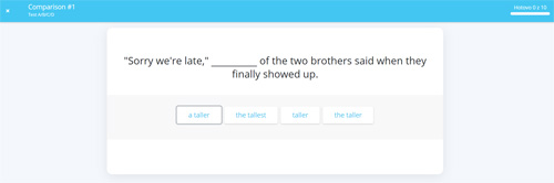 Každá otázka má nastaveno, pro jakou je určena úroveň a na jaký jev či jaké jevy se zaměřuje. Aplikace umí sama testy sestavit podle požadovaných kritérií. V každém případě vždy respektuje úroveň uživatele. Může pro vás tedy na míru sestavit např. náhodný test zaměřený na gramatiku, slovní zásobu nebo obojí. Může ale také sestavit třeba pouze test na používání členů, místních předložek, předpřítomného času, frázových sloves apod.