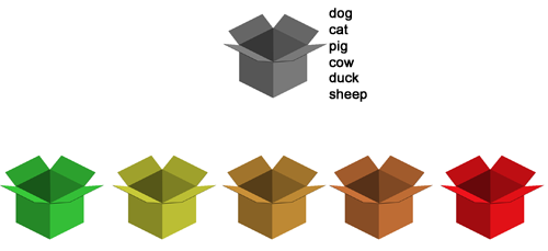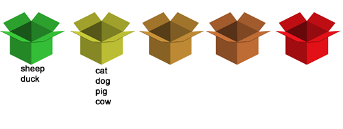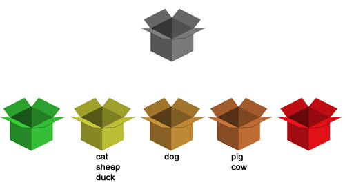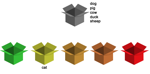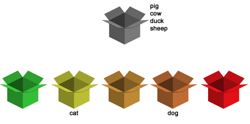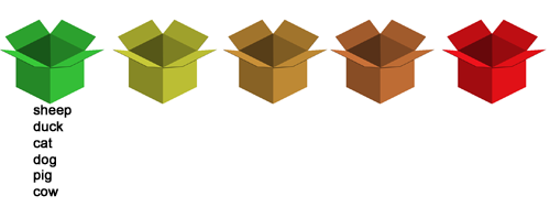 Když začne zkoušení, všechna slovíčka jsou umístěna v jakési šedé krabičce (tam jsou všechna slovíčka, která ještě ve zkoušení nebyla). Pro ilustraci budeme pracovat s šesti slovíčky označující zvířata: