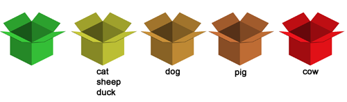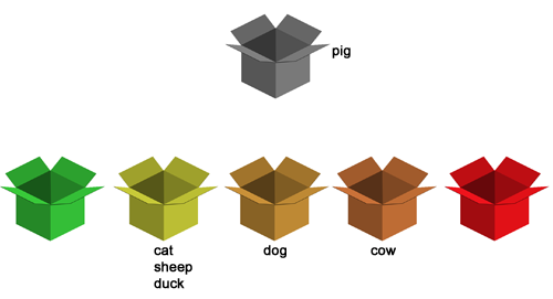 Potřebujeme se tedy stále naučit slovíčka dog a cow. Ani jedno v tuto chvíli ještě nemůže padnout, aby se slova neopakovala moc brzy po sobě. Proto počítač vezme další slovíčko z šedé krabičky, které ještě nebylo. Bude to slovíčko pig. Uděláme v něm chybu, přesune se tedy do krabičky č. 4.